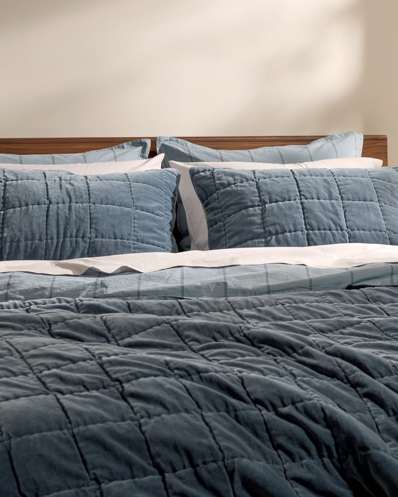 Finish your bed with this set of two decorative shams. Hand stitched with an allover box pattern, these shams feature a plush cotton velvet front and reverse to a natural linen-cotton blend for balance that’s both luxe and lived-in. Pair with the matching quilt for a seasonal statement that’s just the right amount of extra.