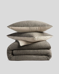 Crafted from a breathable blend of linen and cotton, this duvet cover and sham set combines softness with natural structure. The front is woven in a dimensional honeycomb pattern using black and natural yarns, while the back is finished in a smooth cotton-linen blend for comfort against the skin.