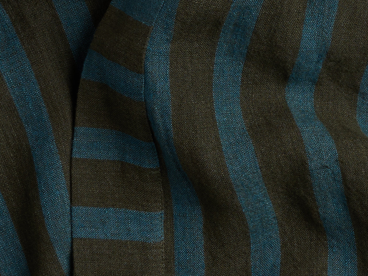 This robe is made from heavyweight, softly-textured linen. The stripes are yarn-dyed warp, a unique technique that involves dyeing certain threads before weaving, which allows for more saturated color. Features two side pockets, a waist tie, and reverse-stripe detailing at the trim.